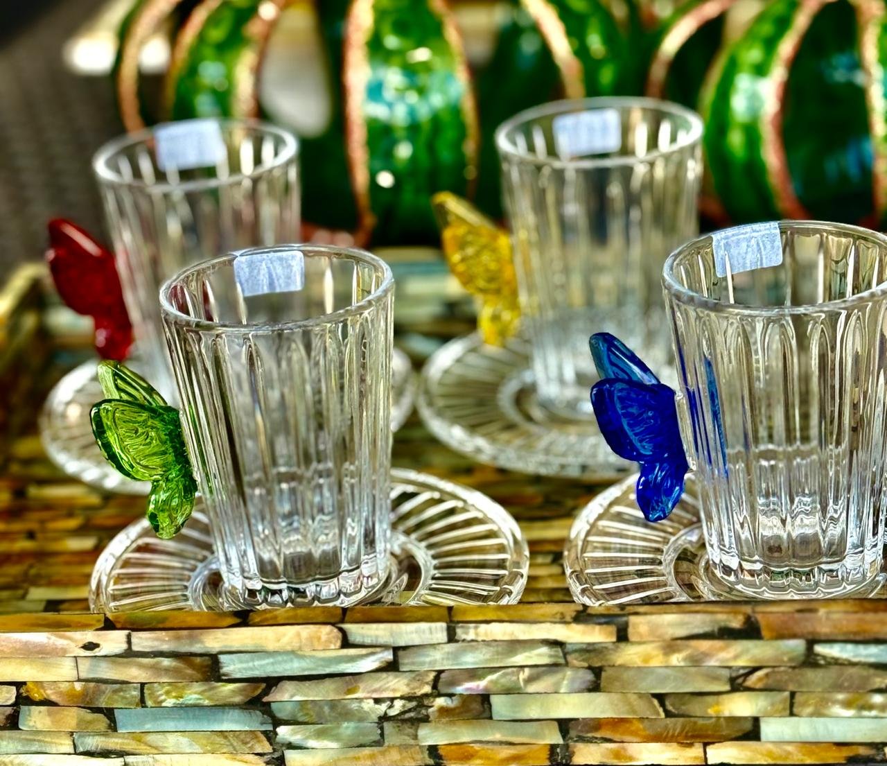 Fabricado com materiais de alta qualidade, o conjunto é composto por vidro resistente que preserva o brilho e a transparência mesmo com o uso diário. As alças detalhadas em forma de borboletas são cuidadosamente pintadas, sendo verdadeiras obras de arte. Este design exclusivo combina perfeitamente funcionalidade e estilo, tornando as xícaras ideais para cafés, chás ou qualquer outra bebida.